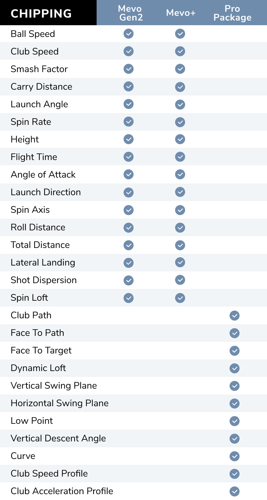 The 11 additional data parameters are available for both full swing and chipping sessions.